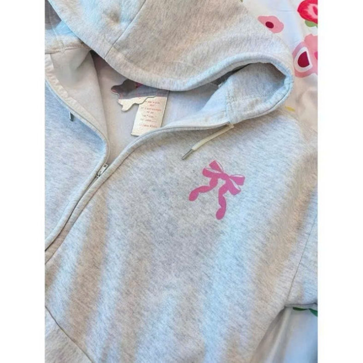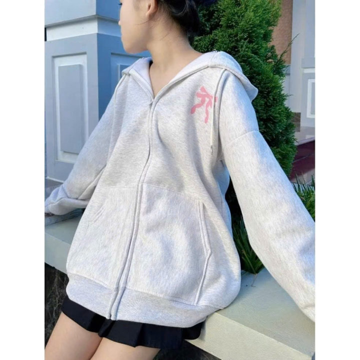 Thiết kế: Trơn màu xám basic, in Nơ hồng ở ngực trái, túi trước rộng rãi.