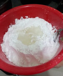 Kế đến, bạn đong tiếp 250ml nước nóng (chưa tới 100 độ C) và cho từ từ vào bột. Mỗi lần đổ nước vào bột, bạn đảo đều và nhanh tay, cứ lần lượt 3 – 4 lần đổ nước vào bột như vậy đến khi hết nước.
