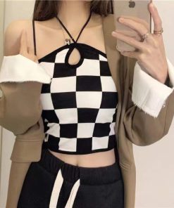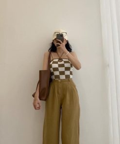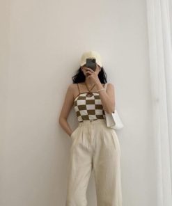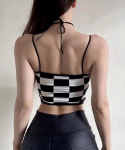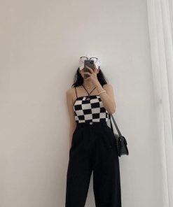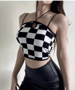 – Thiết kế áo 2 dây với họa tiết kẻ caro độc đáo, phối dây cổ cá tính
