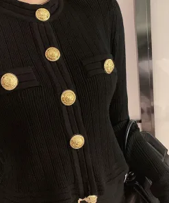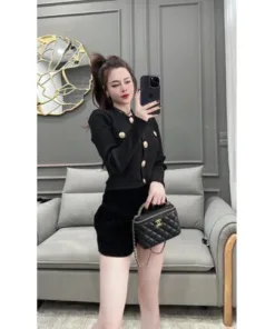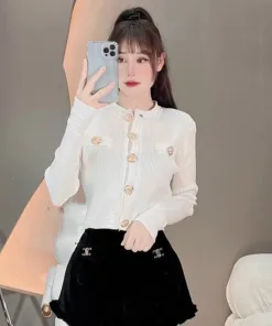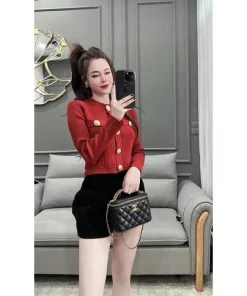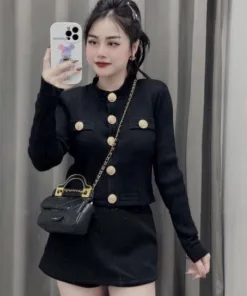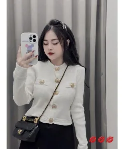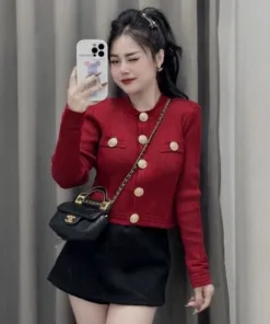 ÁO CARDIGAN DÁNG NGẮN CỔ TRÒN PHỐI KHUY VÀNG NHẸ NHÀNG, SANG TRỌNG