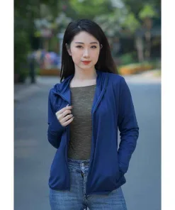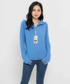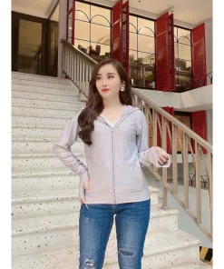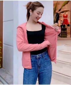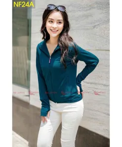 - Áo chống nắng xỏ ngón bảo vệ bàn tay khỏi rám nắng, cổ áo có thể kéo cao lên để che nắng cho phần cổ của bạn nữ.