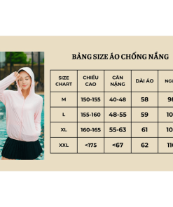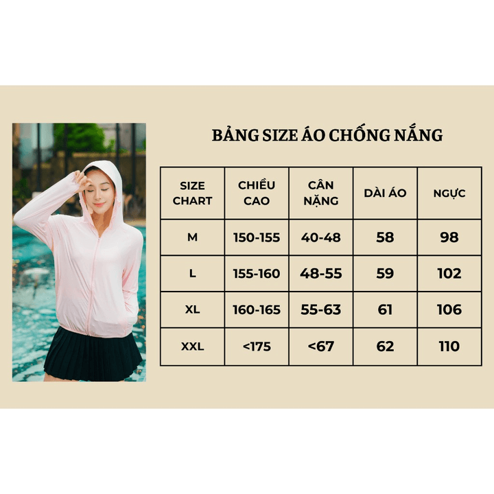 + XL : Chiều cao 160-165cm, cân nặng 55-63kg, dài áo 61cm, vòng 1 106cm