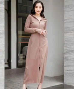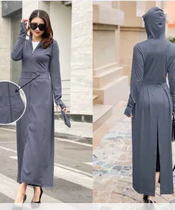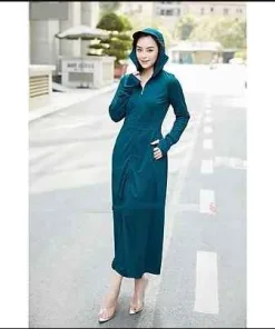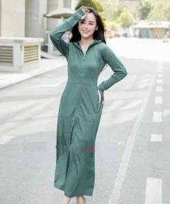 - Đai eo bản to tạo eo và tôn phom dáng, mũ trùm đầu sâu, có lưỡi trai che chắn kèm khẩu trang, váy liền áo dài che kín chân, có xẻ sau thuận tiện đi xe máy.