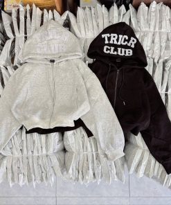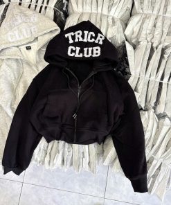 Áo được thiết kế với phần logo TRICR CLUB nổi bật trên mũ, tạo điểm nhấn cá tính và cực kỳ trendy. Form áo croptop ngắn giúp outfit trở nên hiện đại, dễ phối cùng quần jean cạp cao, chân váy hoặc quần jogger.
