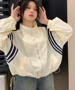 Thiết kế khóa kéo trước tiện lợi, cổ đứng giữ ấm tốt, bo chun ở tay áo giúp chắn gió, đồng thời phần gấu áo có dây rút điều chỉnh để tạo dáng ôm hoặc xòe tùy ý. Phù hợp mix cùng quần jean, quần jogger, chân váy thể thao hoặc short để tạo outfit năng động, cá tính.