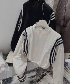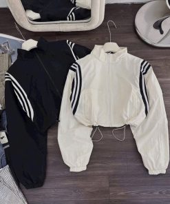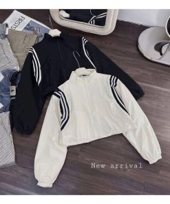 Áo khoác gió nữ form croptop dáng thể thao, thiết kế năng động với 2 màu chủ đạo: đen cá tính và trắng kem thanh lịch. Áo có điểm nhấn là các sọc ngang 3 line ở vai và tay áo, mang phong cách streetwear trẻ trung, hiện đại. Chất liệu dù cao cấp, nhẹ, mềm, chống thấm nhẹ, phù hợp cho cả thời tiết mát mẻ lẫn những ngày se lạnh.