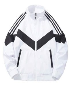Áo khoác thể thao trắng đen với thiết kế tối giản nhưng đầy cá tính, nổi bật với họa tiết sọc 3 line chạy dọc vai kết hợp chi tiết mũi tên chữ V đen trước ngực, tạo nên phong cách thể thao năng động, khỏe khoắn và đậm chất streetwear.