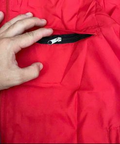 Thiết kế với gam màu đỏ chủ đạo kết hợp viền sọc xanh navy dọc tay áo, mang lại cảm giác thể thao và cá tính. Chất vải dù mỏng nhẹ, chống gió tốt, thích hợp mặc khi đi chạy bộ, tập thể dục, hoặc đi học, đi chơi ngày se lạnh.