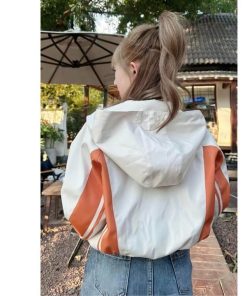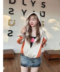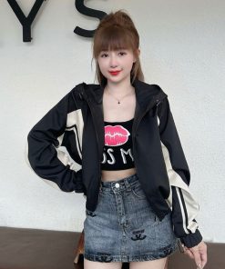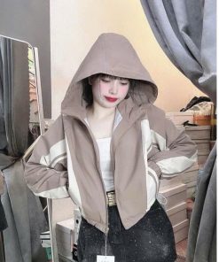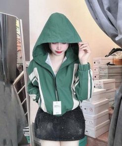 – Aó với thiết kế croptop cực kì tôn dáng, họa tiết kẻ sọc năng động phối với mũ trùm đầu tiện lợi