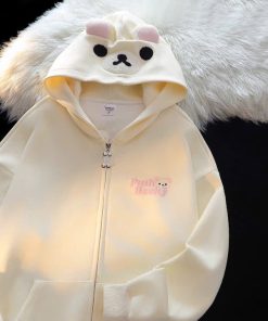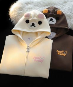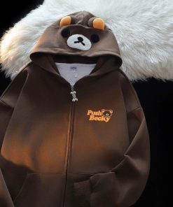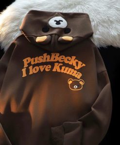 Điểm nhấn nổi bật của áo nằm ở phần mũ có tai gấu 3D cùng họa tiết mặt gấu thêu nổi cực kỳ dễ thương. Trên lưng áo được in dòng chữ nổi bật “PushBecky I love Kuma” với font chữ mềm mại, tạo cảm giác trẻ trung và đáng yêu.