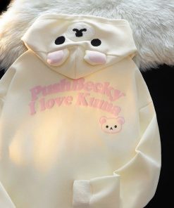 Điểm nhấn nổi bật của áo nằm ở phần mũ có tai gấu 3D cùng họa tiết mặt gấu thêu nổi cực kỳ dễ thương. Trên lưng áo được in dòng chữ nổi bật “PushBecky I love Kuma” với font chữ mềm mại, tạo cảm giác trẻ trung và đáng yêu.