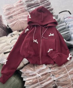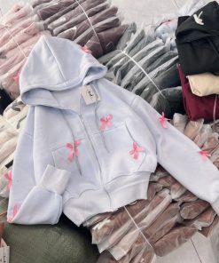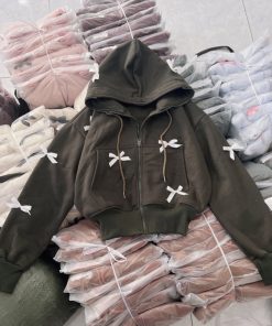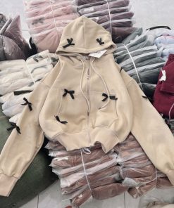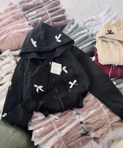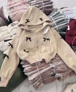 Trang trí nơ ruy băng đối màu ở thân trước, tay áo và mũ – tạo điểm nhấn nữ tính nhưng vẫn cá tính.