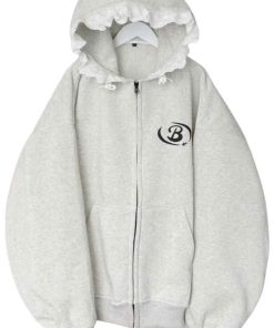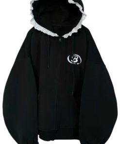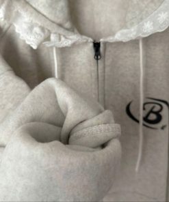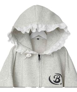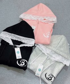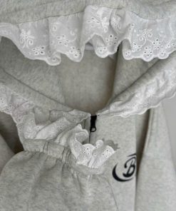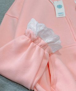Điểm nhấn nổi bật của sản phẩm là phần mũ hoodie viền ren hoa tinh tế và ống tay bo phối ren độc đáo, tạo hiệu ứng vừa đáng yêu vừa sang chảnh. Phần khóa kéo tiện lợi giúp bạn dễ dàng mặc – cởi và biến tấu theo nhiều kiểu: mặc khoác ngoài hoặc kéo khóa kín như sweater.