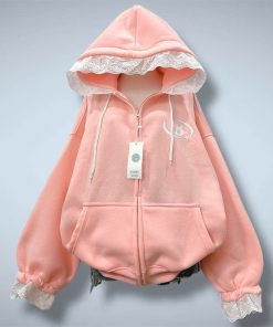 Điểm nhấn nổi bật của sản phẩm là phần mũ hoodie viền ren hoa tinh tế và ống tay bo phối ren độc đáo, tạo hiệu ứng vừa đáng yêu vừa sang chảnh. Phần khóa kéo tiện lợi giúp bạn dễ dàng mặc – cởi và biến tấu theo nhiều kiểu: mặc khoác ngoài hoặc kéo khóa kín như sweater.