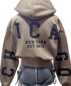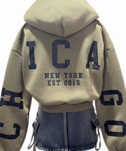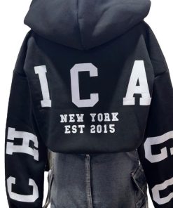 Điểm nhấn: In nổi bật dòng chữ CHICAGO chạy dọc hai tay và lưng áo kết hợp logo NEW YORK EST 2015, mang vibes cá tính, trẻ trung, cực ngầu.
