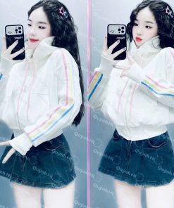 Tên sản phẩm: ÁO KHOÁC LỬNG NỮ VẢI NỈ PHỐI 3 SỌC TỚI MŨ TAY XỎ NGÓN CÓ TÚI TRONG UT33 – GOLDEN DREAM