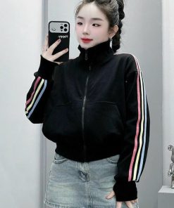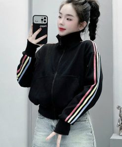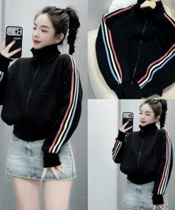 áo Khoác Nỉ Croptop Có Túi Trong Phối Tay 3 Sọc Cầu Vồng Thiết Kế Tay Xỏ Ngón -htm Fashion