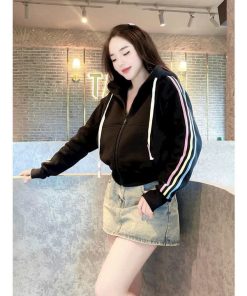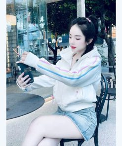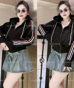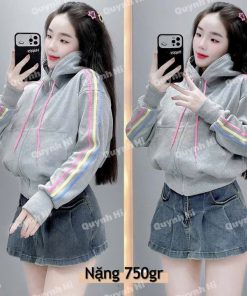 Điểm nhấn đặc biệt của áo nằm ở dải sọc màu pastel chạy dọc 2 tay áo – phối màu nhẹ nhàng, xinh xắn giúp nàng nổi bật một cách tinh tế. Áo có khóa kéo trước, mũ trùm to, tay bo và gấu bo tạo dáng gọn gàng, phù hợp với nhiều vóc dáng.