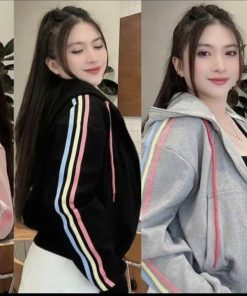 Điểm nhấn đặc biệt của áo nằm ở dải sọc màu pastel chạy dọc 2 tay áo – phối màu nhẹ nhàng, xinh xắn giúp nàng nổi bật một cách tinh tế. Áo có khóa kéo trước, mũ trùm to, tay bo và gấu bo tạo dáng gọn gàng, phù hợp với nhiều vóc dáng.