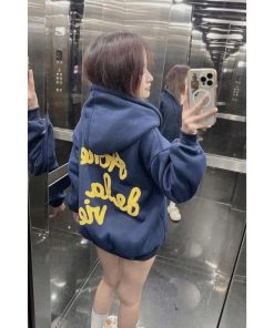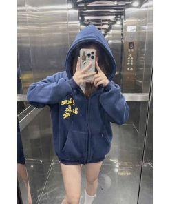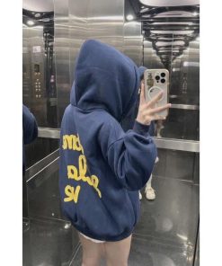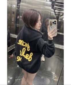 Chiếc áo hoodie nữ form rộng với gam màu đen chủ đạo, nổi bật với dòng chữ in sau lưng màu vàng đầy cá tính. Phông chữ nghệ thuật, phá cách mang lại cảm giác năng động, trẻ trung và cực kỳ "trendy".