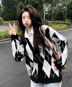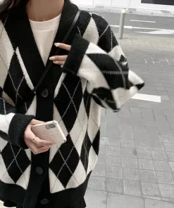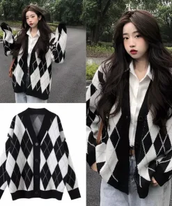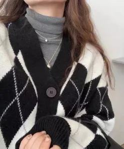 - Tên Sản phẩm: Áo khoác nữ Cardigan họa tiết kim cương phối đen trắng