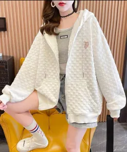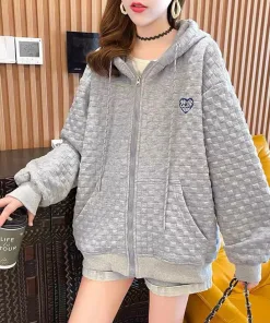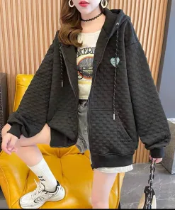 Áo Khoác Nữ Có Kèm Mũ Trùm Phối Theo Phong Cách Khoá Kéo Mẫu Mới Form Rộng Chất Vải Đan Vuông Thêu Hình Trái Tim Hot Trend-HTM FASHION