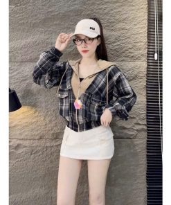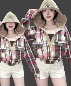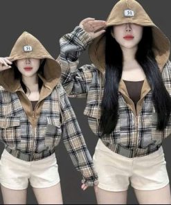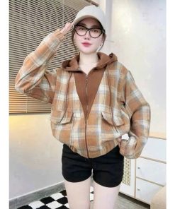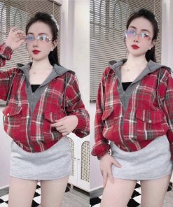 Tên sản phẩm: ÁO KHOÁC NỮ FORM LỬNG VẢI DẠ CARO PHỐI MŨ THÊU CHỮ R SIÊU XINH TP33