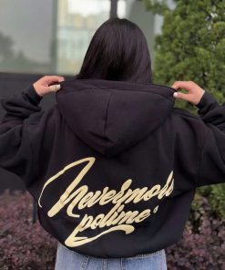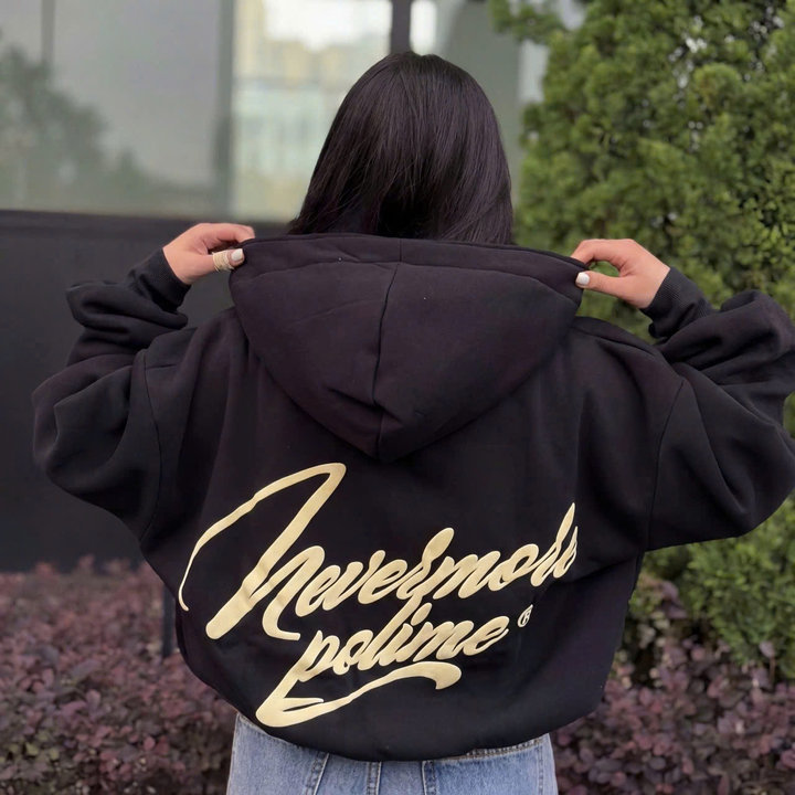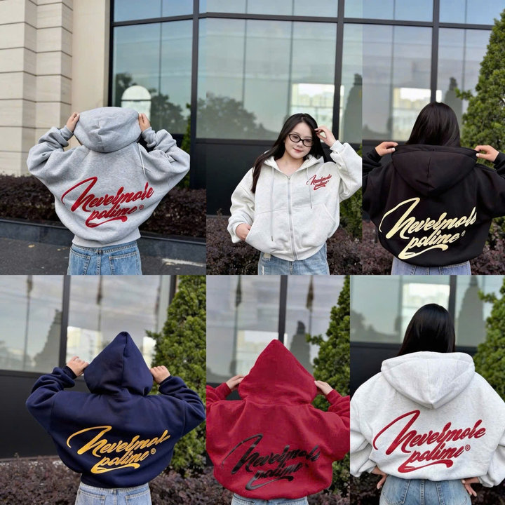 Tên sản phẩm: ÁO KHOÁC NỮ VẢI NỈ BÔNG FORM BOXY TAY PHỒNG IN CHỮ NEVERMORE, ÁO CÓ TÚI TRONG TP29 – GOLDEN DREAM