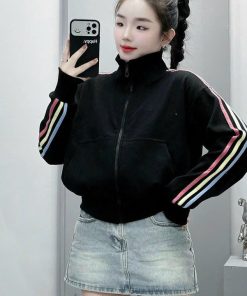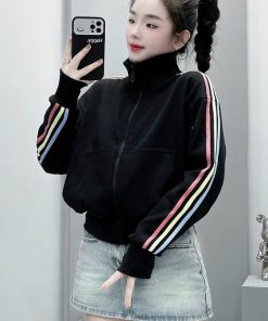 Tên sản phẩm: ÁO KHOÁC NỮ VẢI NỈ FORM LỬNG CỔ CAO PHỐI SỌC CẦU VỒNG DỌC TAY UT30 – GOLDEN DREAM