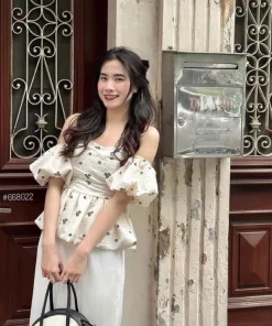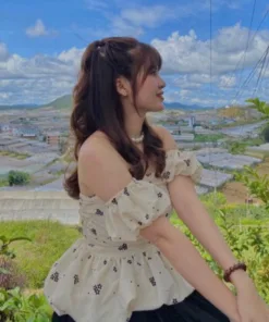 Tên sản phẩm: ÁO KIỂU BẸT VAI IN HOA CÚC NHÍ CHẠY NHÚN SAU CO GIẢN VẢI XỐP XỊN – KIM