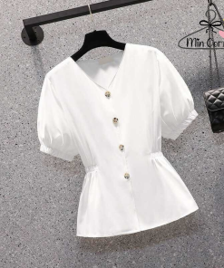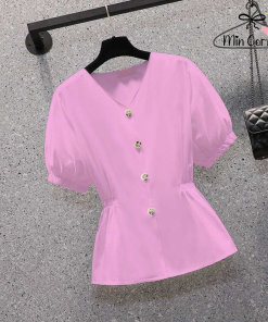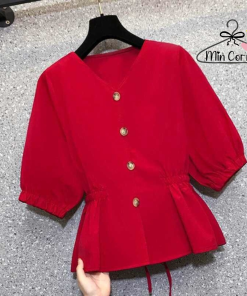 Áo kiểu phong cách hàn quốc thiết kế tay bồng cổ V, cột eo tôn dáng. Kiểu áo dễ dàng kết hợp nhiều loại trang phục, đi chơi, đi tiệc, du lịch đi làm đều phù hợp