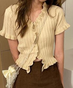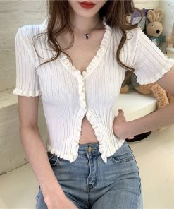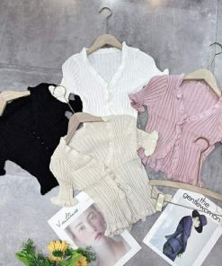 – Thiết kế cổ V kết hợp với phần viền bèo mang lại cho chiếc áo vẻ nữ tính, sexy