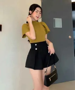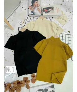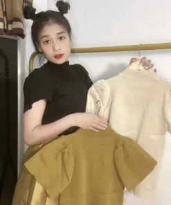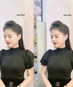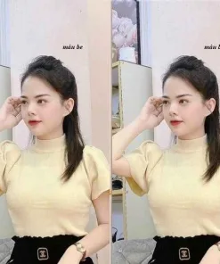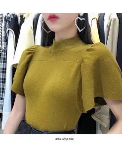 - Áo len ngắn tay, ống tay phồng cánh sen, cổ áo tròn