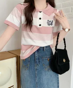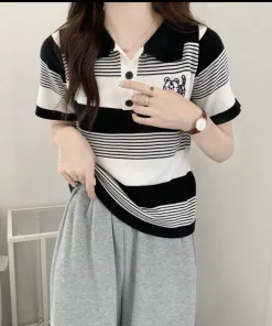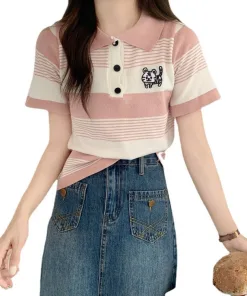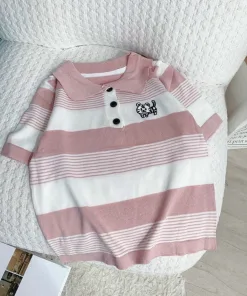 ÁO LEN CỘC TAY CỔ ĐỨC HỌA TIẾT KẺ NGANG THÊU HÌNH HỔ CON