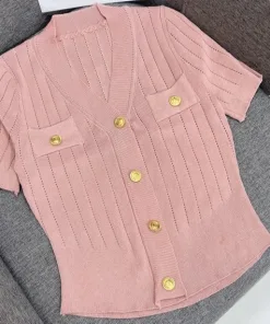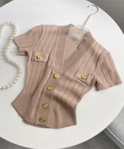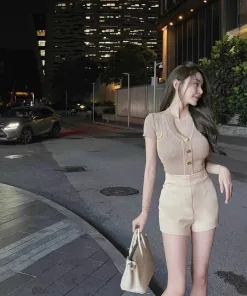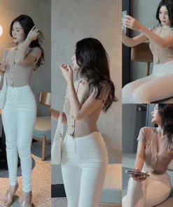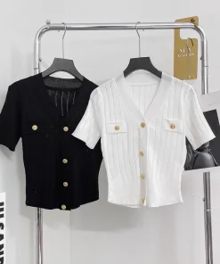 – Thiết kế áo cổ tim sâu giúp chị em khoe trọn vòng 1, dáng áo croptop ôm khoe tôn len đường cong cơ thể. Điểm nhấn giúp chiếc áo trở nên nổi bật là phần khuy cài giả đồng được thiết kế tinh tế, tỉ mỉ