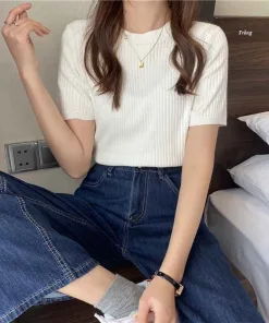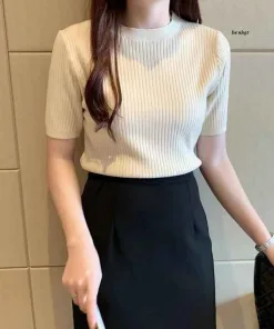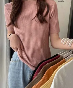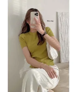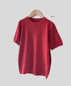 - Mẫu áo cổ tròn, ngắn tay, dễ dàng phối với nhiều kiểu trang phục.