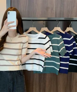 ÁO LEN CỘC TAY CỔ TRÒN DÁNG CROPTOP HỌA TIẾT KẺ NHIỀU MÀU