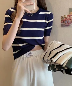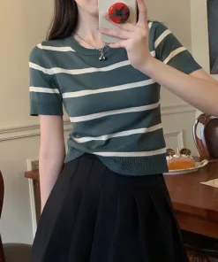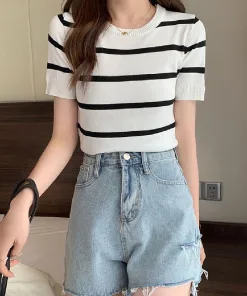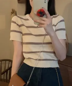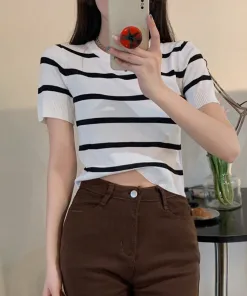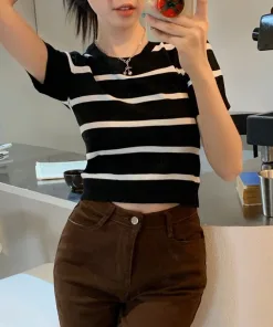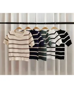 – Thiết kế dáng áo ngắn, họa tiết kẻ sọc với tone màu tương phản làm chiếc áo trở nên nổi bật