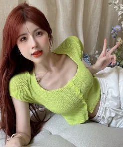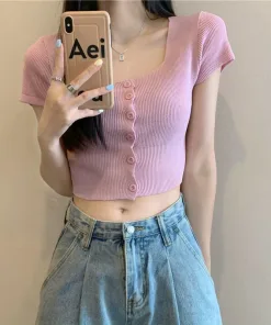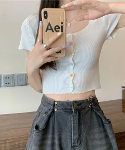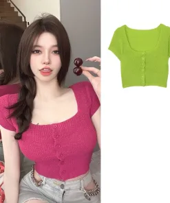 ÁO LEN CROPTOP CỘC TAY CỔ VUÔNG KHUY GIỮA MÀU SẮC CẦU VỒNG