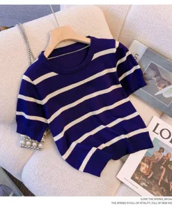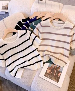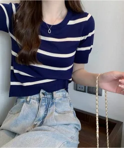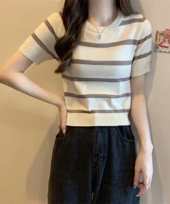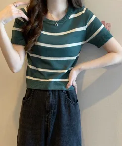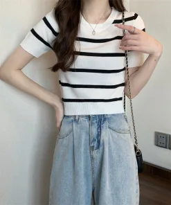ÁO LEN CROPTOP NGẮN TAY HỌA TIẾT KẺ SỌC MÀU SẮC TƯƠNG PHẢN
