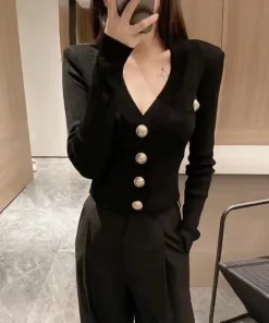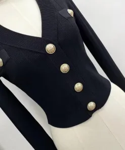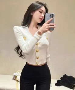 - Áo thiết kế dáng dài tay, cổ tim xẻ sâu quyến rũ phối khuy cúc vàng bắt mắt.