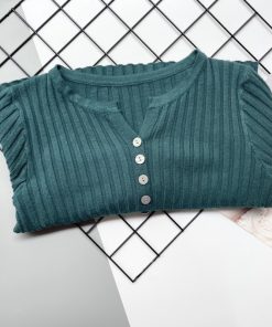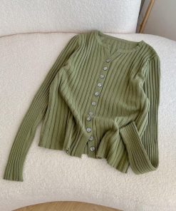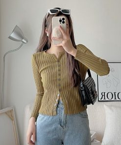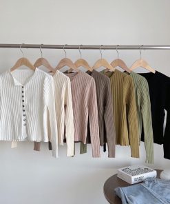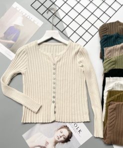 ÁO LEN ĐŨA DÀI TAY CỔ TRÒN KHUY GIỮA PHỐI 11 KHUY PHONG CÁCH HÀN QUỐC