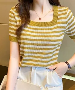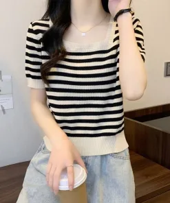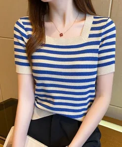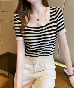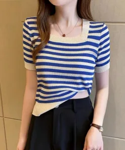 – Áo được thiết kế dạng cổ vuông khoe trọn phần xương quai xanh của các chị em, họa tiết kẻ sọc là điểm nhấn của áo