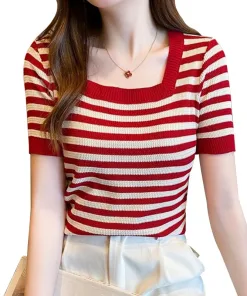 ÁO LEN MONTOGHI CỔ VUÔNG HỌA TIẾT KẺ NGANG