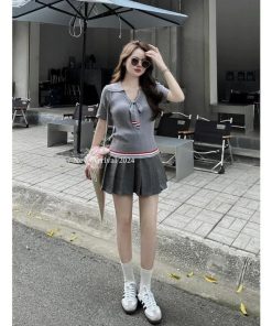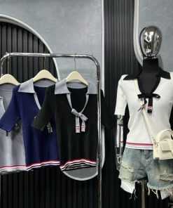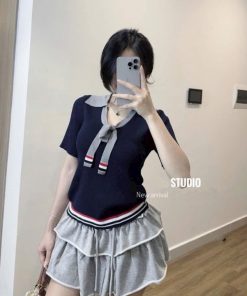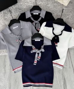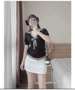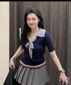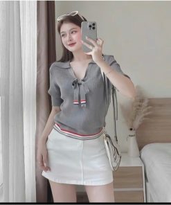 – Form áo ôm vừa người cực kì tôn dáng. Gấu áo kẻ sọc tạo điểm nhấn năng động phối với dây cột nơ xinh xắn