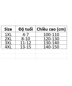 - Size 4XL: bé 13-15 tuổi -> chiều cao 140 – 150cm