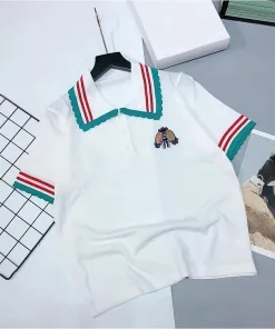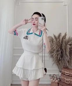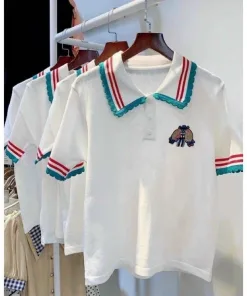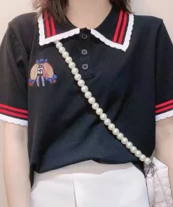 🎀 Áo phông nữ ngắn tay phối viền cổ, thêu hình cô gái nhỏ 🎀