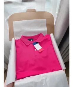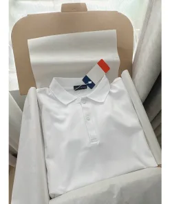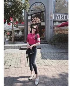 – Mẫu áo ngắn tay cổ bẻ basic, họa tiết 2 vòng kẻ 1 bên ống tay