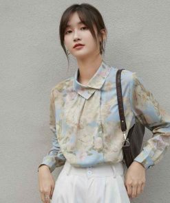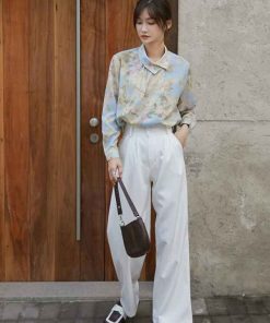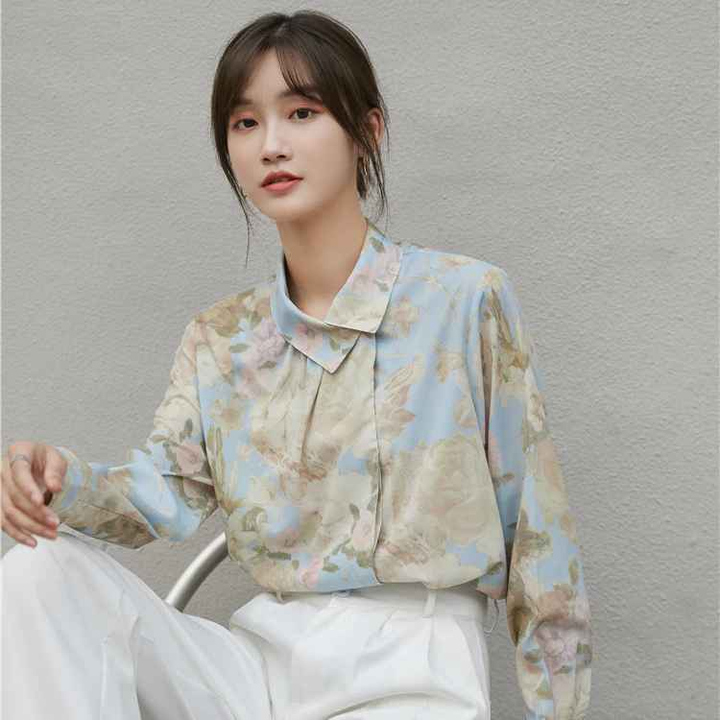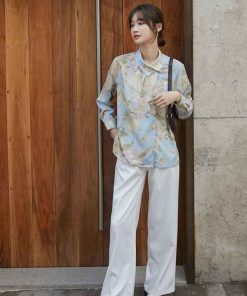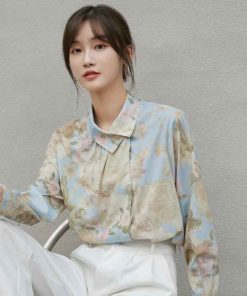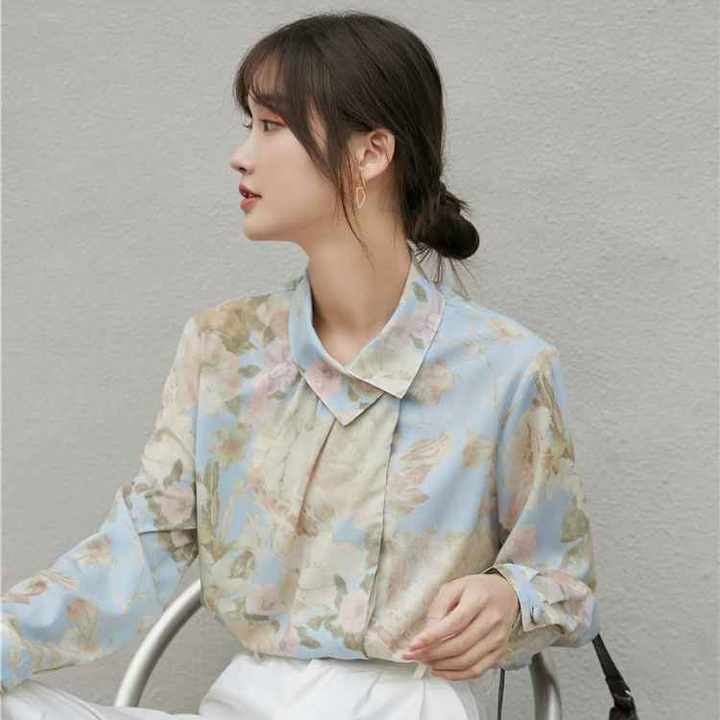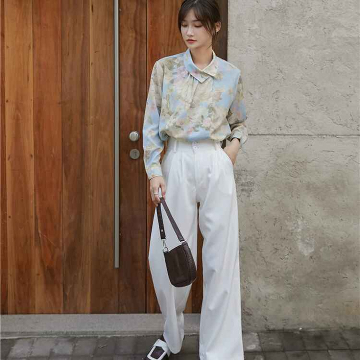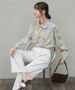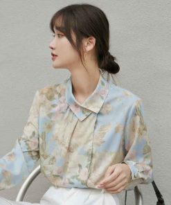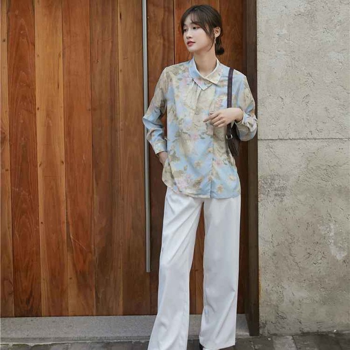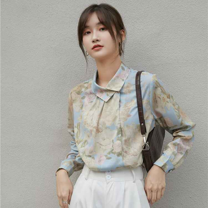 - Áo sơ mi hoa Vintage nút cổ lệch với chất liệu cotton – Polyeste mềm mát dễ làm phẳng, mặc thoải mái. Phối cùng váy bút chì hoặc quần baggi trắng nữ thời trang công sở vintage.