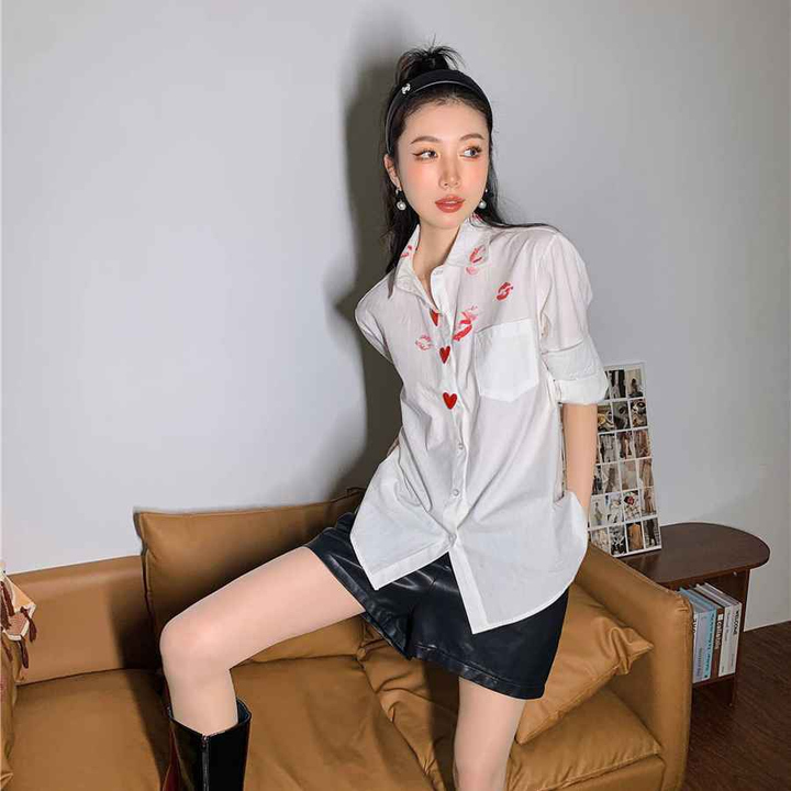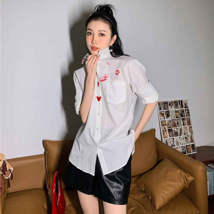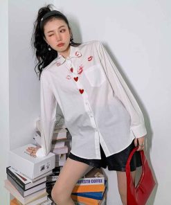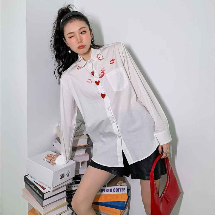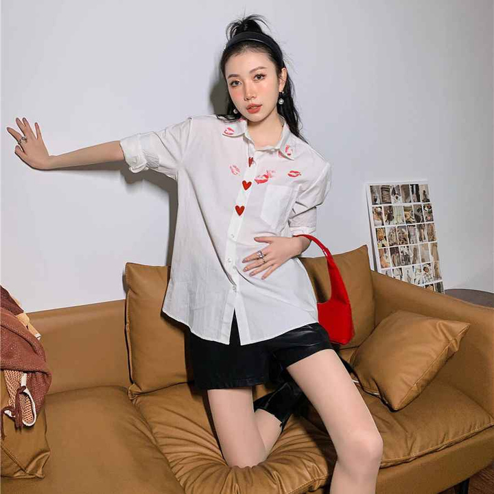 - Áo sơ mi trắng dấu son môi nút trái tim đỏ với chất liệu mềm dễ làm phẳng, mặc thoải mái form rộng rãi.